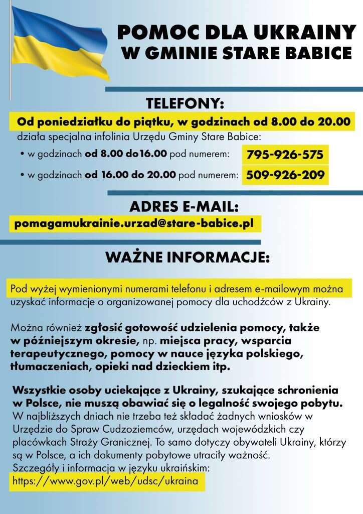 Urząd Gminy Stare Babice uruchomił specjalną infolinię oraz adres e-mail: pomagamukrainie.urzad@stare-babice.pl