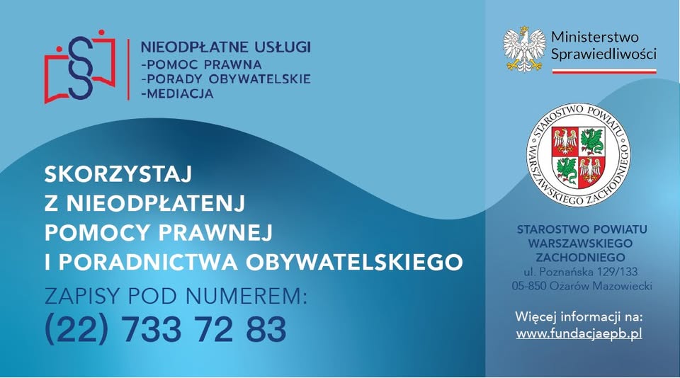Powiat Warszawski Zachodni informuje o możliwości skorzystania z nieodpłatnej pomocy prawnej oraz poradnictwa obywatelskiego w Powiecie Warszawskim Zachodnim.