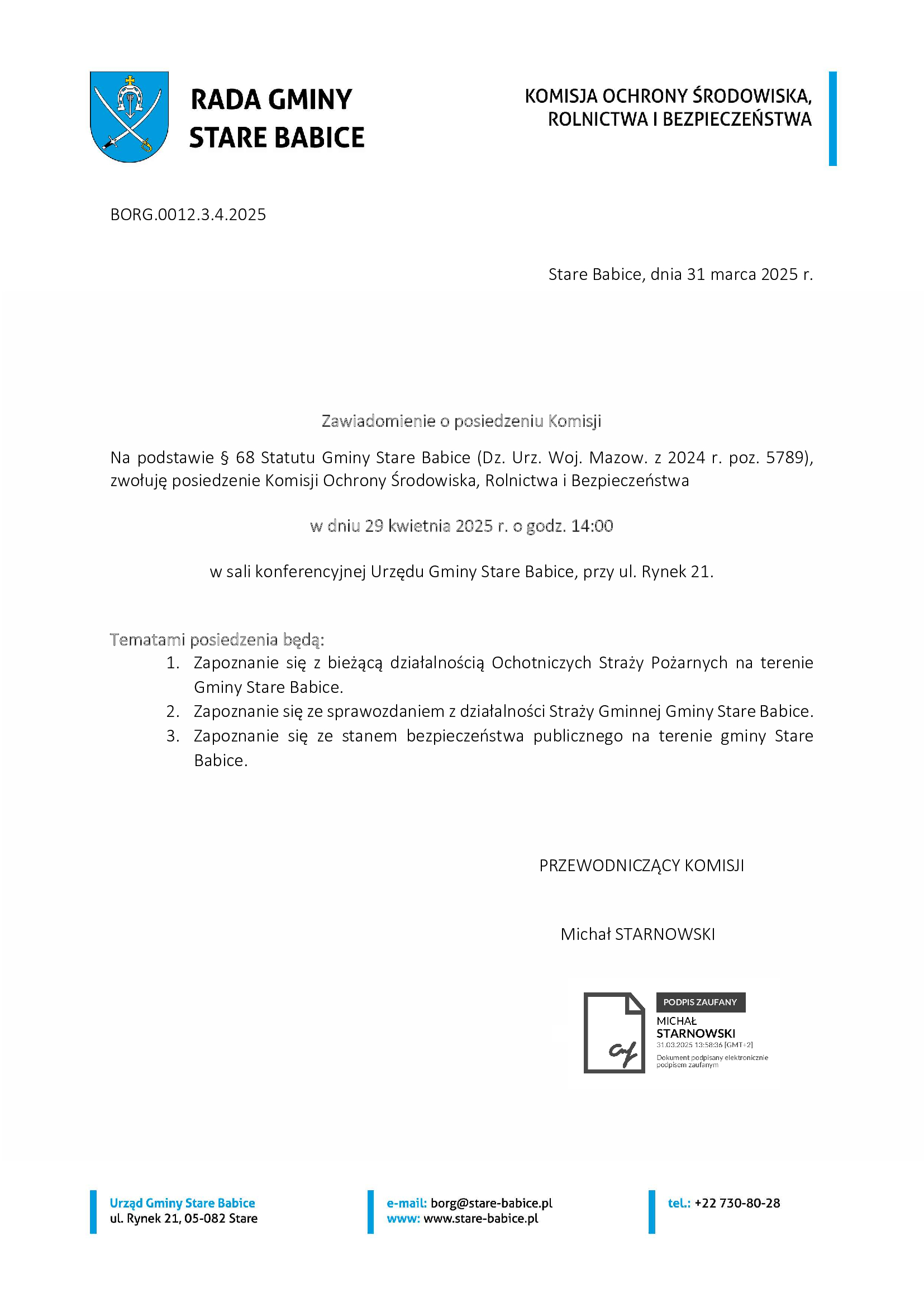 Posiedzenie odbędzie się w sali konferencyjnej Urzędu Gminy Stare Babice, przy ul. Rynek 21.