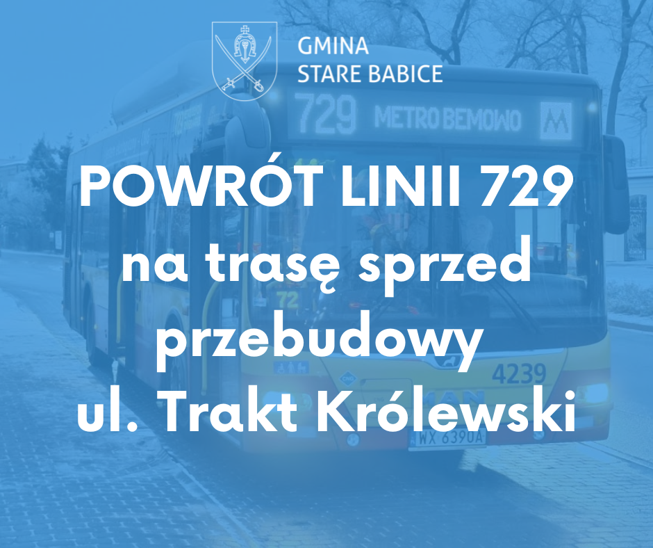 informujemy, iż od 1 stycznia 2025 roku linia autobusowa nr 729 zostanie przywrócona na trasę sprzed przebudowy ul. Trakt Królewski. Autobusy będą kursować z pętli Metro Bemowo do Mariewa.