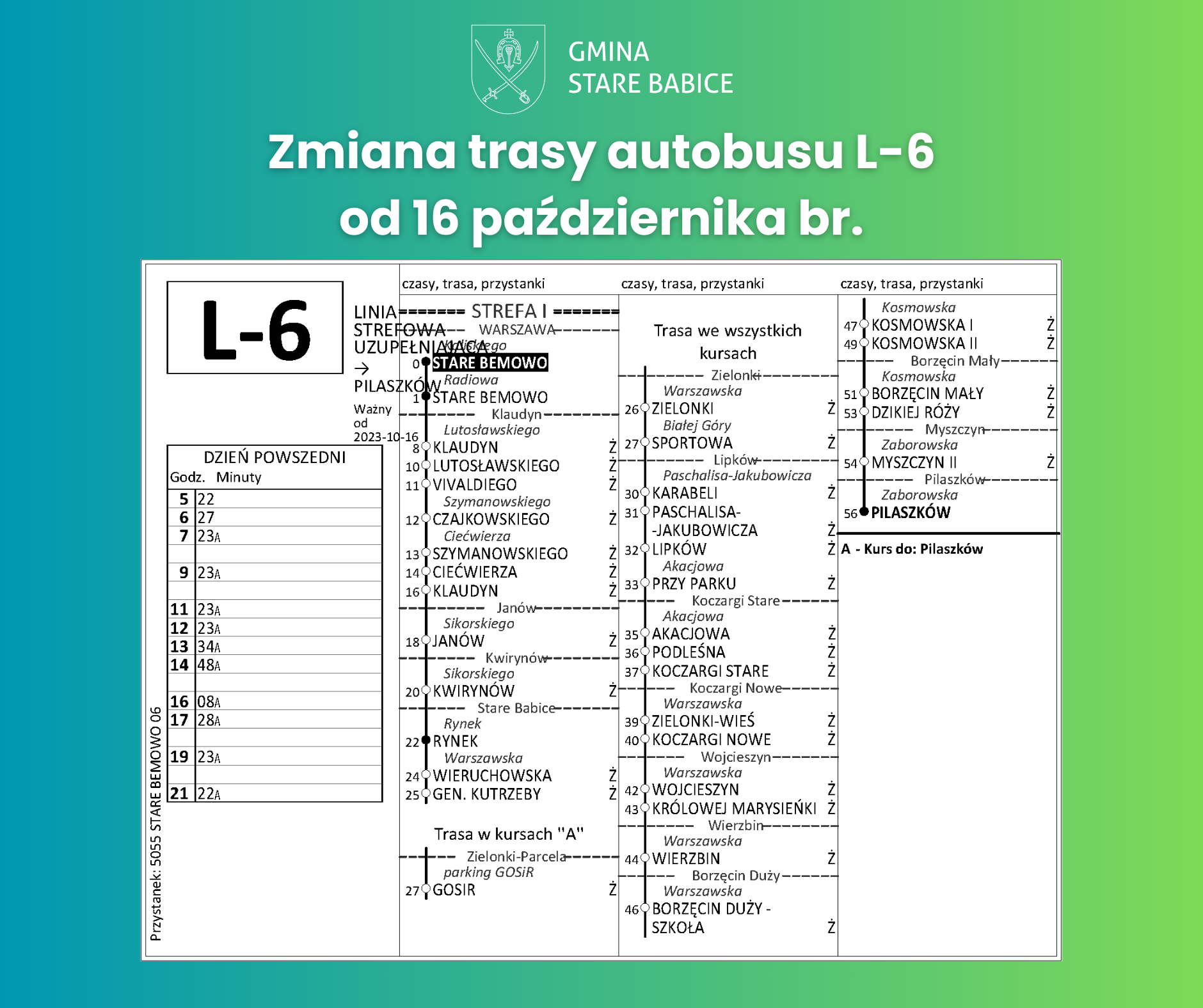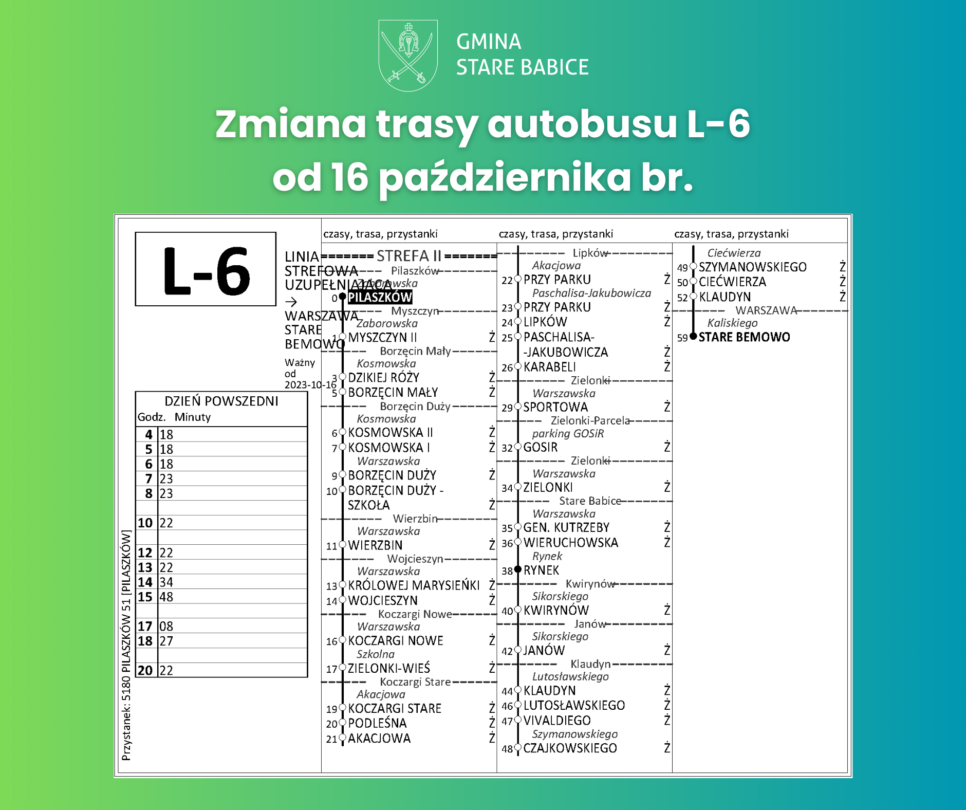 Informujemy, że po przeprowadzonych rozmowach pomiędzy Wójtem Gminy Stare Babice a Zarządem Transportu Miejskiego trasa autobusu linii L-6 wraca od 16 października na swoją poprzednią trasę.