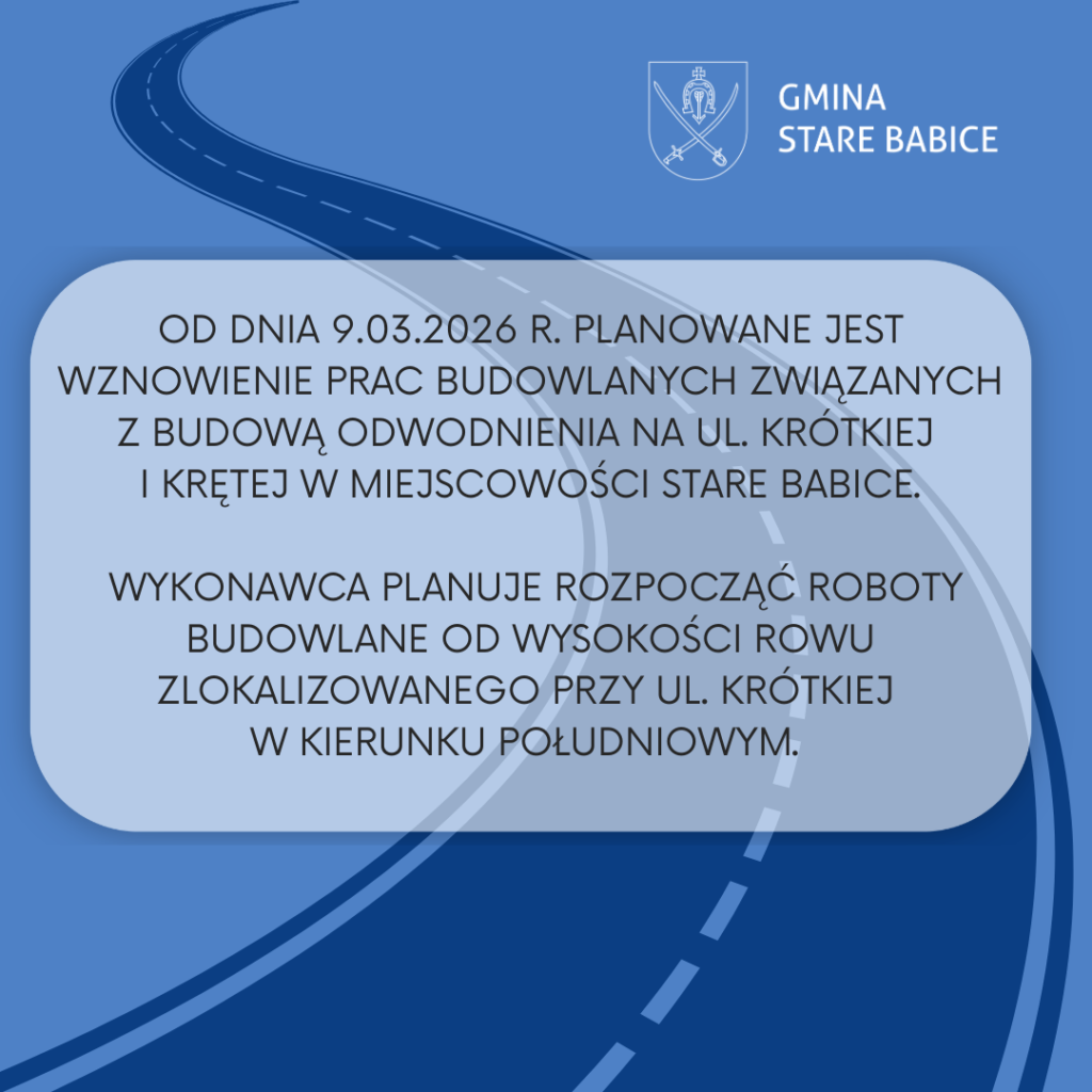 🛣️ W związku poprawą warunków atmosferycznych od dnia 9.03.2026 r. (poniedziałek) planowane jest wznowienie prac budowlanych związanych z budową odwodnienia na ul. Krótkiej i Krętej w miejscowości Stare Babice.
