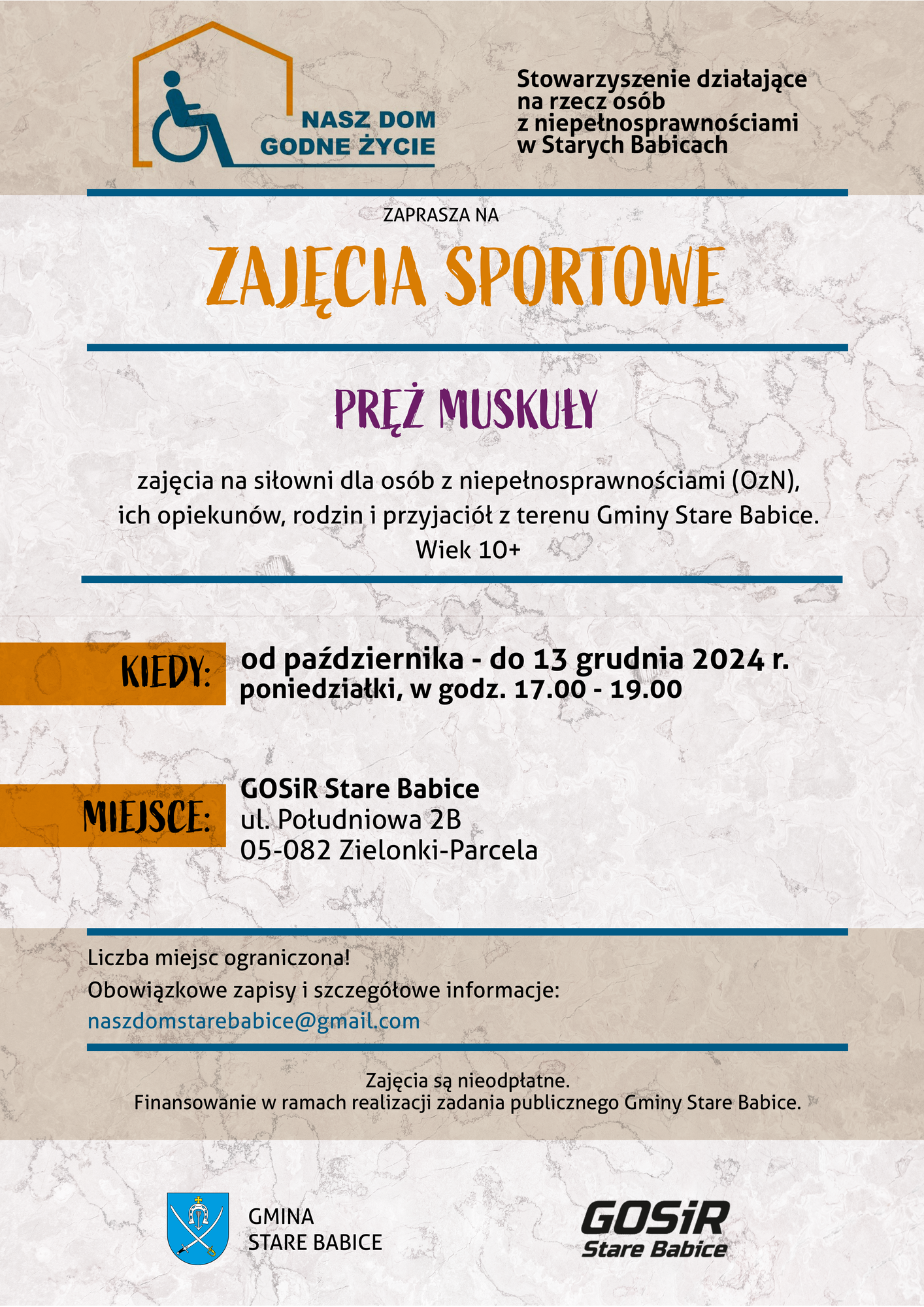 Zajęcia są nieodpłatne. Finansowanie w ramach realizacji zadania publicznego Gminy Stare Babice.