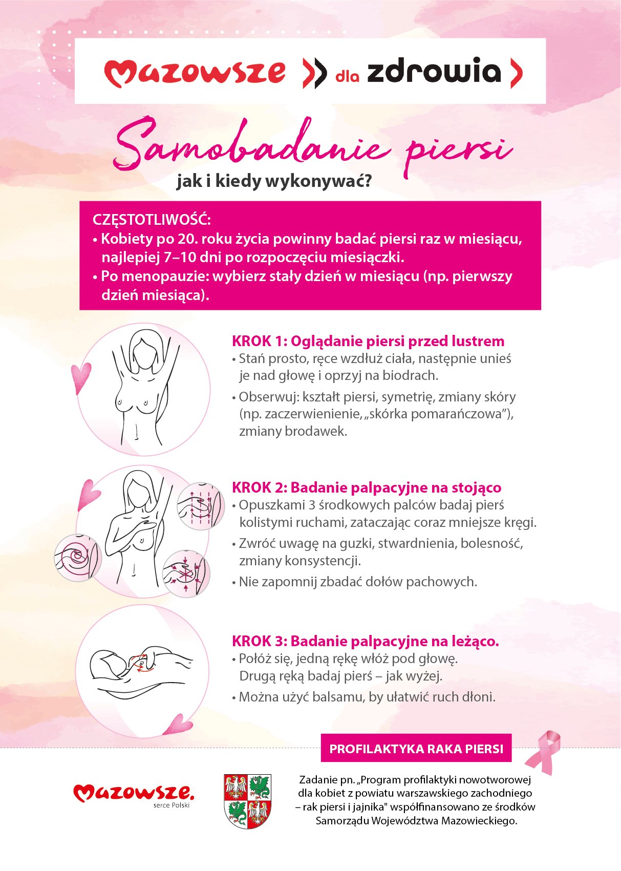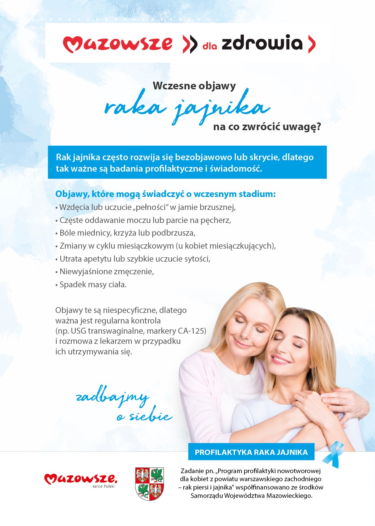 Powiat Warszawski Zachodnizaprasza Panie powyżej 18 roku życia z terenu powiatu warszawskiego zachodniego na bezpłatne badania profilaktyczne: „Program profilaktyki nowotworowej dla kobiet z powiatu warszawskiego zachodniego – rak piersi i jajnika” współfinansowano ze środków Samorządu Województwa Mazowieckiego.
