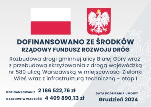 W dniu wczorajszym na Sejmiku Województwa Mazowieckiego zapadła decyzja o dofinansowaniu zadania „Rozbudowa drogi gminnej ulicy Białej Góry wraz z przebudową skrzyżowania z drogą wojewódzką nr 580 ul. Warszawską w miejscowości Zielonki Wieś wraz z infrastrukturą techniczną – etap I” kwotą około 1,4 mln zł.