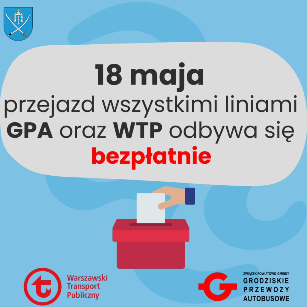 Uwaga! Informujemy, iż w związku z zarządzeniem nr 748/2025 Prezydenta m.st. Warszawy z 9 maja 2025 roku, 18 maja wszystkie przejazdy liniami Grodziskich Przewozów Autobusowych oraz Warszawskiego Transportu Publicznego będą BEZPŁATNE.