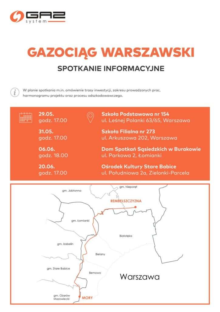 Dzisiaj o godzinie 17:00 w Domu Kultury Stare Babice, ul. Południowa 2a, Zielonki-Parcela odbędzie się spotkanie z GAZ-SYSTEM dotyczące budowy Gazociągu Warszawskiego. Nowy gazociąg, który będzie liczył 28,5 km, połączy Rembelszczyznę z Morami. Trasa przebiegnie przez kilka podwarszawskich gmin i trzy stołeczne dzielnice.