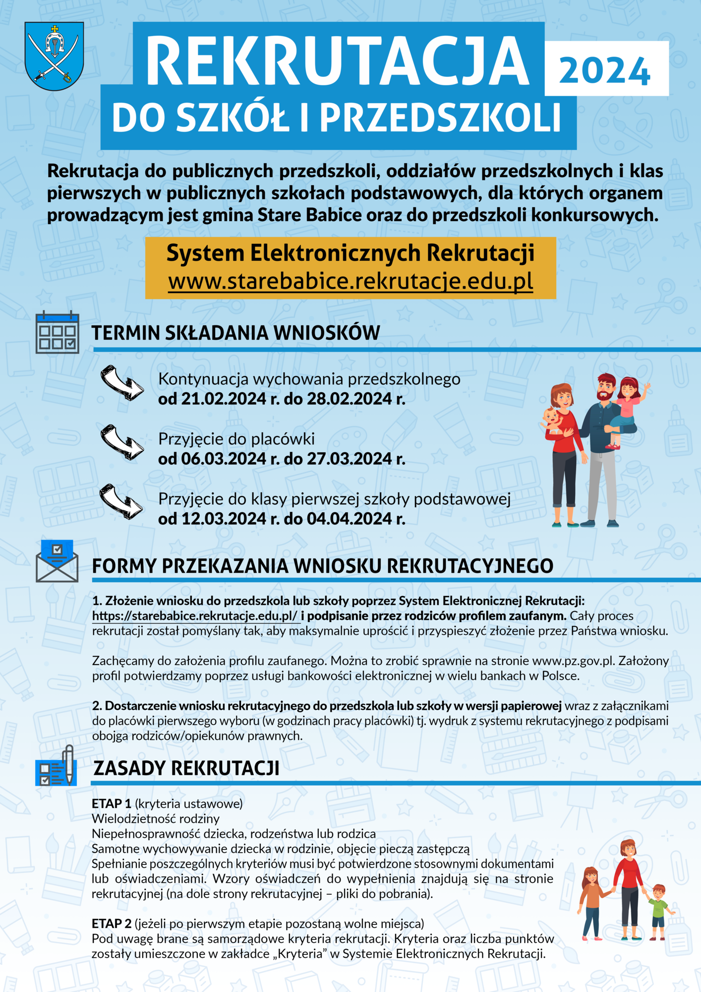 Terminy, kryteria i dokumenty brane pod uwagę w postępowaniu rekrutacyjnym określa Zarządzeniem Wójta Gminy Stare Babice nr 14/2024 z dnia 25 stycznia 2024 r. w sprawie ustalenia terminów przeprowadzenia postępowania rekrutacyjnego i postępowania uzupełniającego, w tym terminów składania dokumentów do publicznych przedszkoli, oddziałów przedszkolnych w publicznych szkołach podstawowych i klas pierwszych publicznych szkół podstawowych dla których organem prowadzącym jest gmina Stare Babice, kryteriów branych pod uwagę w postępowaniu rekrutacyjnym i postępowaniu uzupełniającym oraz dokumentów niezbędnych do potwierdzenia spełnienia tych kryteriów, a także liczby punktów możliwych do uzyskania za poszczególne kryteria na rok szkolny 2024/2025.