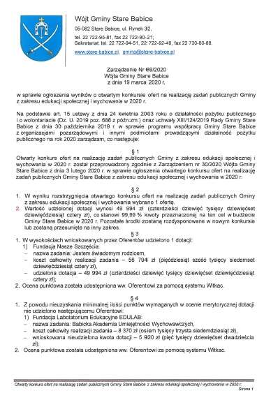 przedstawiamy zarządzenie wójta w sprawie rozstrzygnięcia otwartego konkursu ofert na realizację zadań publicznych Gminy Stare Babice z zakresu edukacji społecznej i wychowania w 2020 r.