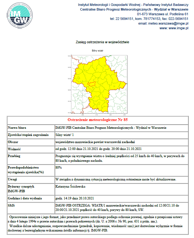 IMGW-PIB Centralne Biuro Prognoz Meteorologicznych Wydział w Warszawie wydało ostrzeżenie meteorologiczne nr 85.