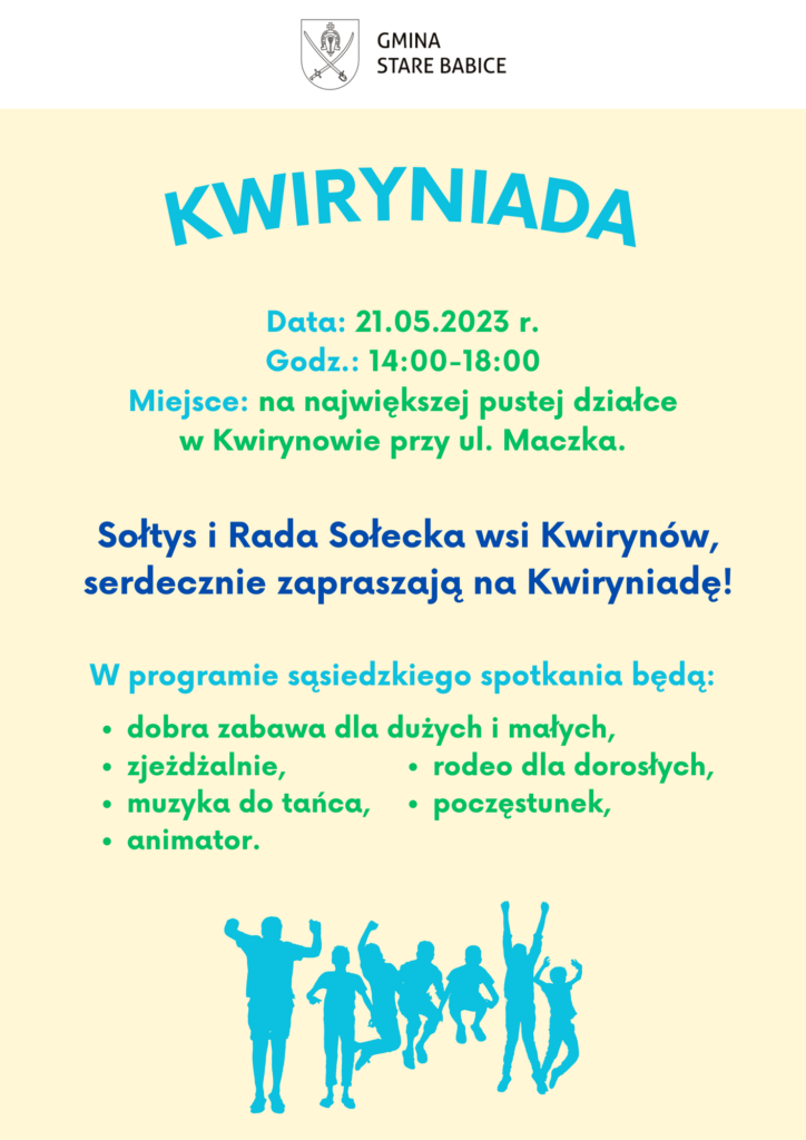 Sołtys i Rada Sołecka wsi Kwirynów serdecznie zapraszają na Kwiryniadę – spotkanie sąsiedzkie, które z pewnością dostarczy mnóstwo radości i rozrywki wszystkim mieszkańcom.