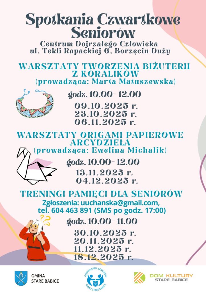 SPOTKANIA CZWARTKOWE SENIORÓW! 21.10.2025 DRUKUJPOBIERZ DO PDF udostępnij Zapraszamy serdecznie wszystkich Seniorów na cykl kreatywnych warsztatów! Warsztaty tworzenia biżuterii z koralików prowadzenie: Marta Matuszewska godz. 10.00–12.00 9.10, 23.10, 6.11.2025 Warsztaty origami – papierowe arcydzieła prowadzenie: Ewelina Michalik godz. 10.00–12.00 13.11, 4.12.2025 Treningi pamięci dla Seniorów Zgłoszenia: uuchanska@gmail.com tel. 604 463 891 (SMS godz. 17:00) godz. 10.00–11.00 30.10, 20.11, 11.12, 18.12.2025 Przyjdź, spróbuj i spędź czas w twórczej atmosferze!