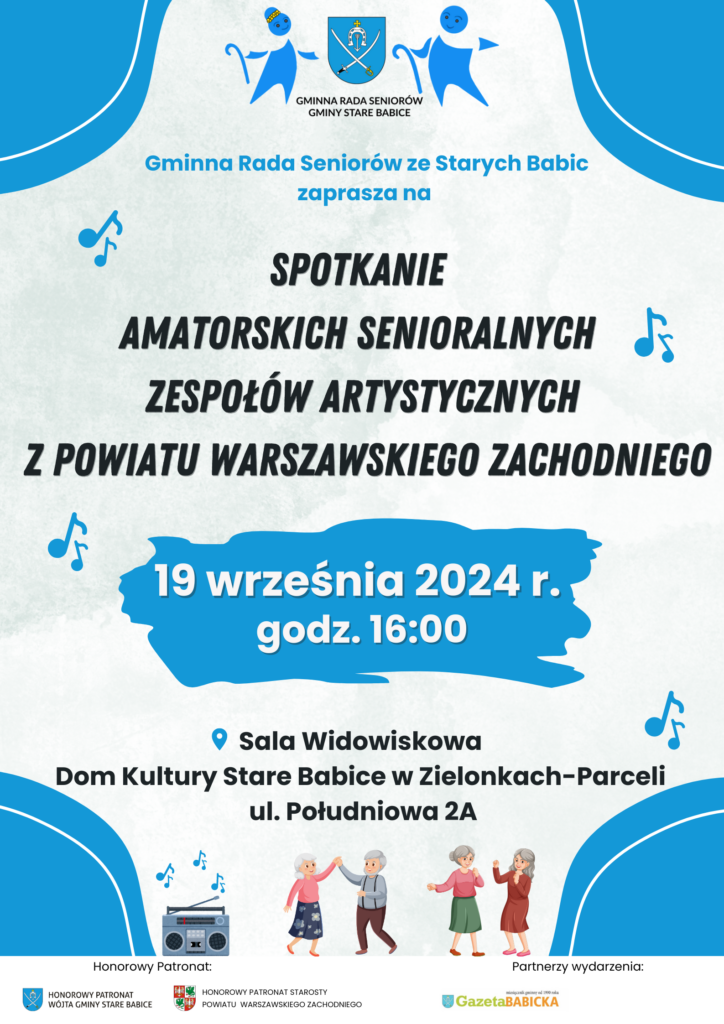 Występy artystyczne Seniorów z powiatu warszawskiego zachodniego odbędą się 19 września 2024 roku w Sali Widowiskowej Domu Kultury Stare Babice o godzinie 16:00