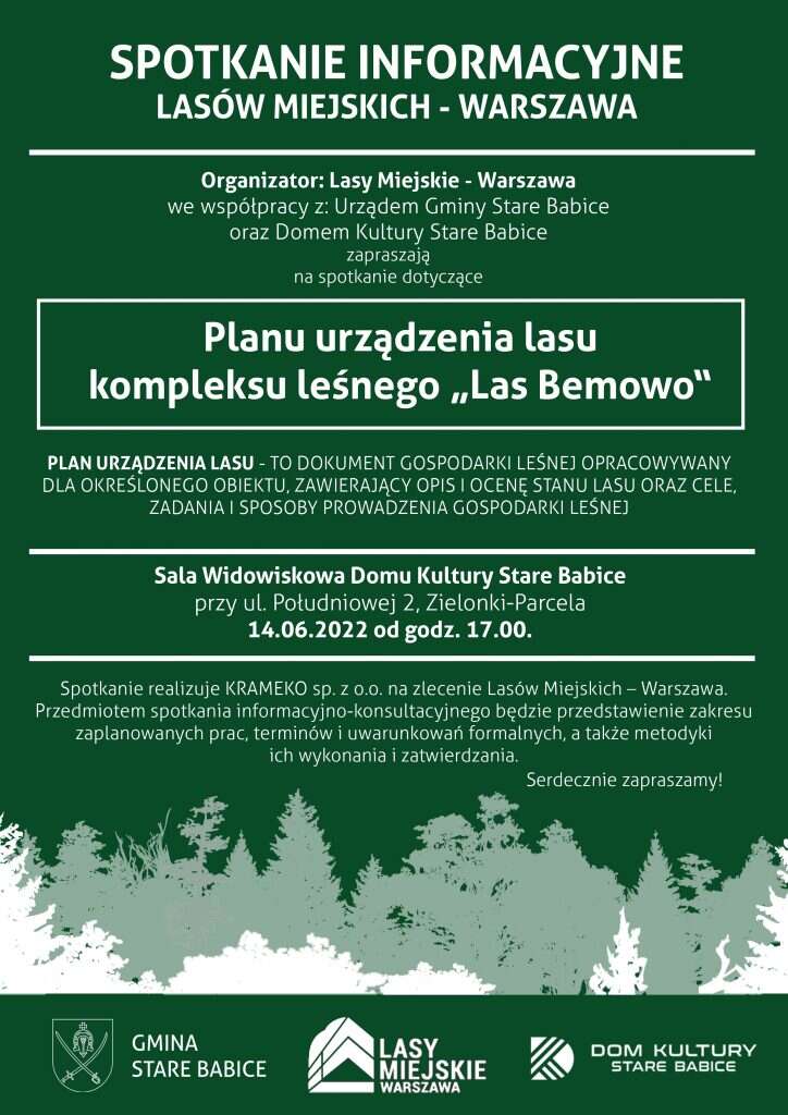 Lasy Miejskie – Warszawa we współpracy z Urzędem Gminy Stare Babice oraz Domem Kultury Stare Babice zapraszają na spotkanie informacyjne dotyczące Planu urządzenia lasu kompleksu leśnego „Las Bemowo”.