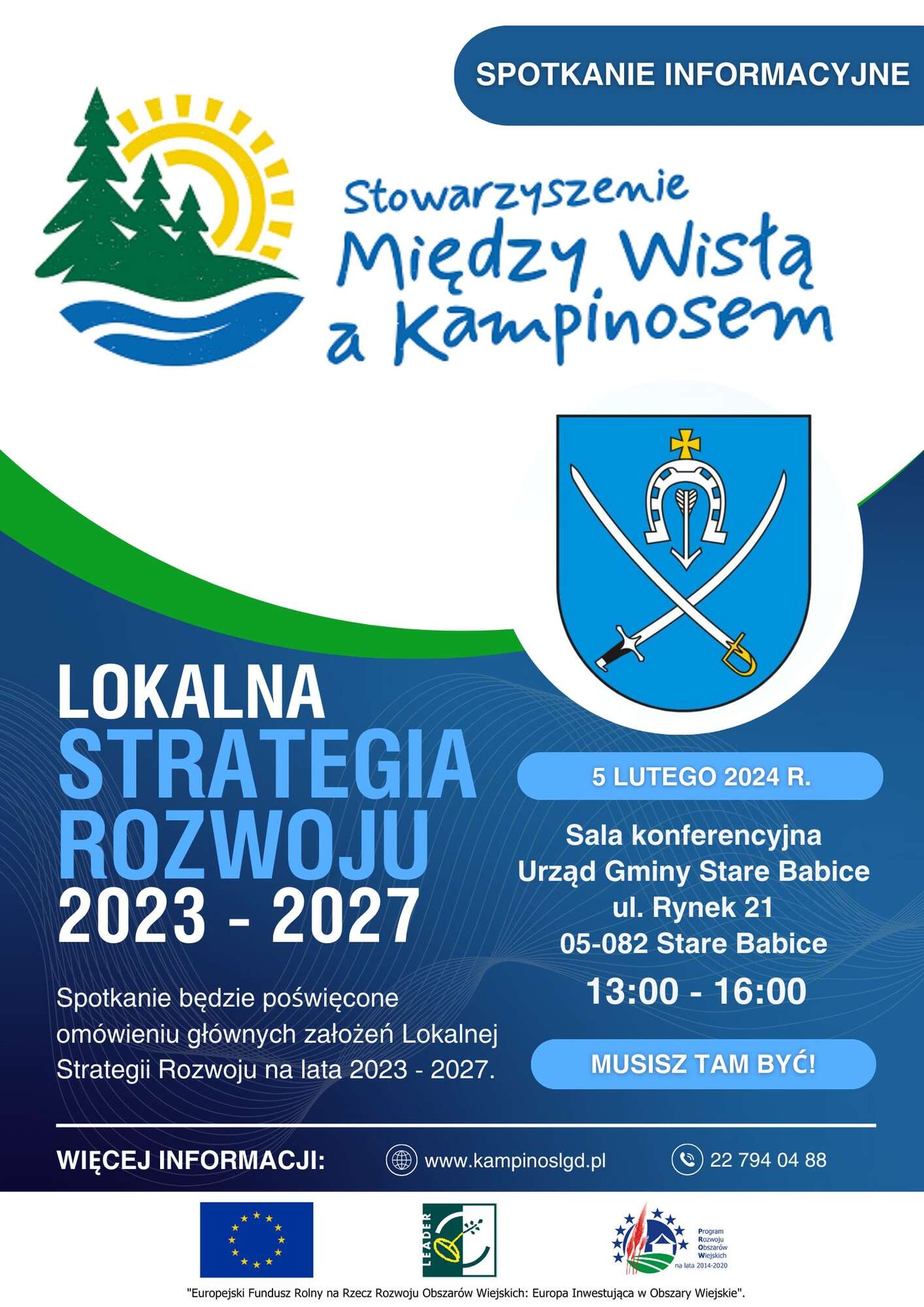 wraz z Stowarzyszenie „Między Wisłą a Kampinosem” zapraszamy na spotkanie informacyjne na temat Lokalnej Strategii Rozwoju 2023 – 2027, które odbędzie się w sali konferencyjnej Urzędu Gminy Stare Babice przy ul. Rynek 21 w dniu 5 lutego 2024 r. w godzinach 13:00 – 16:00.