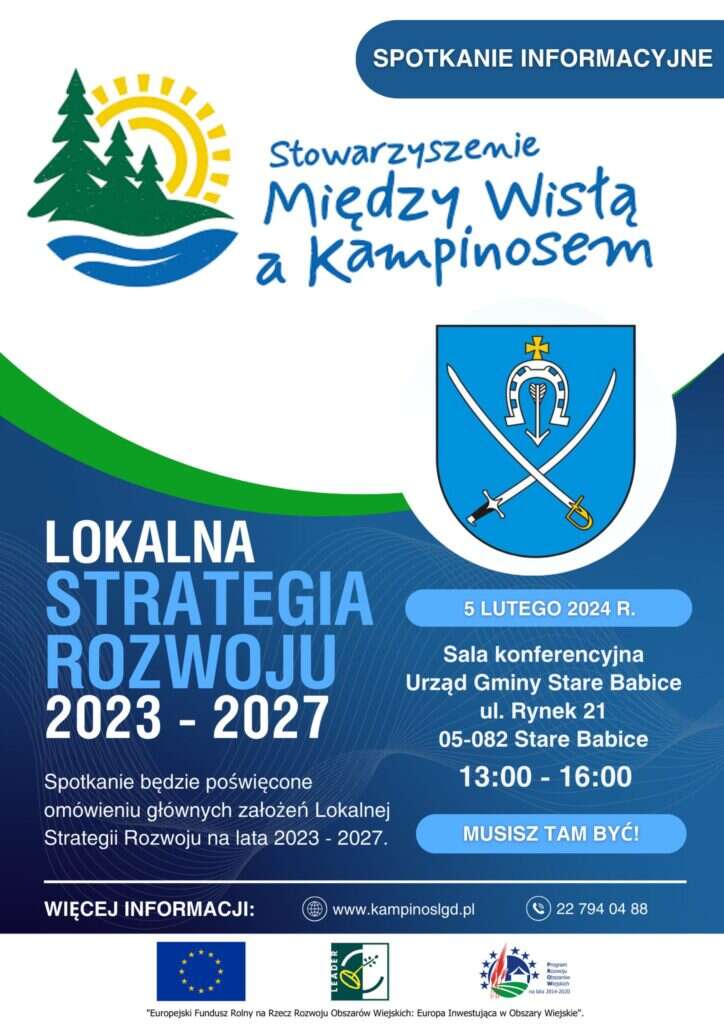 wraz z Stowarzyszenie „Między Wisłą a Kampinosem” zapraszamy na spotkanie informacyjne na temat Lokalnej Strategii Rozwoju 2023 – 2027, które odbędzie się w sali konferencyjnej Urzędu Gminy Stare Babice przy ul. Rynek 21 w dniu 5 lutego 2024 r. w godzinach 13:00 – 16:00.