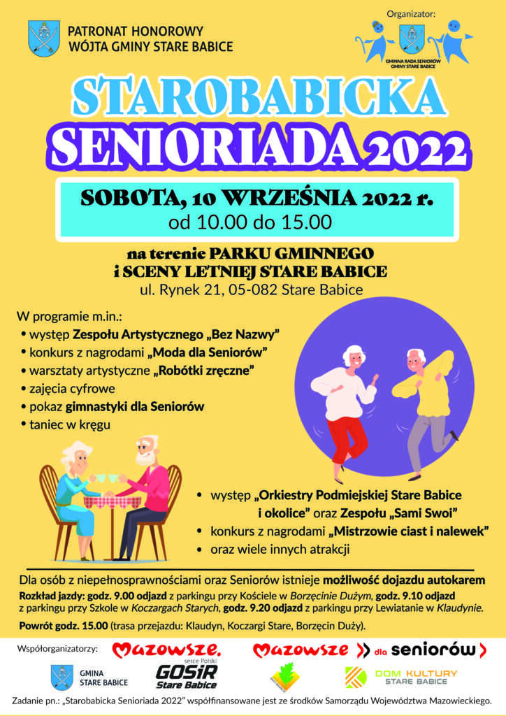 Już w najbliższą sobotę, 10 września 2022 r., w godz. 10.00-15.00, Gminna Rada Seniorów Gminy Stare Babice serdecznie zaprasza na wydarzenie pn. „Starobabicka Senioriada 2022”, które odbędzie się na terenie Parku Gminnego i Sceny Letniej Stare Babice (ul. Rynek 21, 05-082 Stare Babice).
