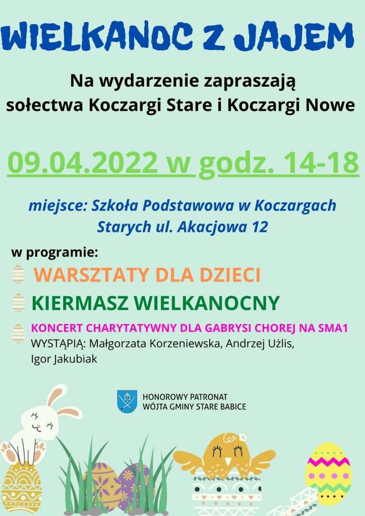 Sołectwo Koczargi Stare oraz sołectwo Koczargi Nowe zapraszają 9 kwietnia 2022 r. w godz. 14.00 – 18.00 na świąteczne spotkanie „Wielkanoc z jajem”, które odbędzie się w Szkole Podstawowej w Koczargach Starych. W ramach wydarzenia przygotowano mnóstwo atrakcji m. in.: