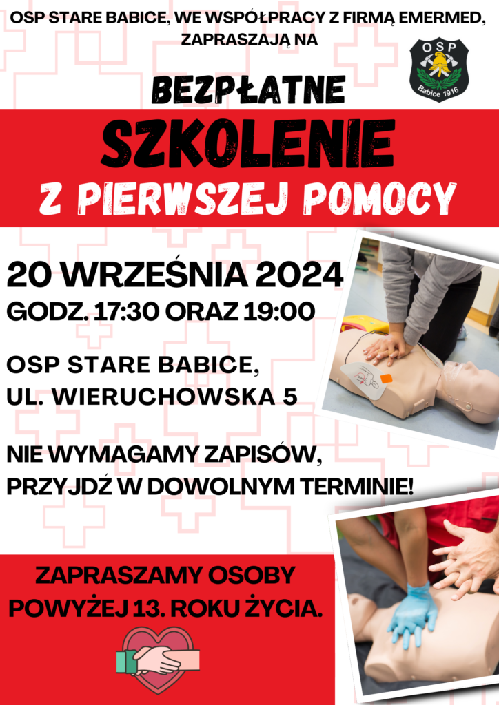 Ochotnicza Straż Pożarna w Starych Babicach wspólnie z firmą Emermed organizują bezpłatne szkolenie z pierwszej pomocy, które odbędzie się 20 września br. w dwóch turach o godzinie 17:30 oraz 19:00.