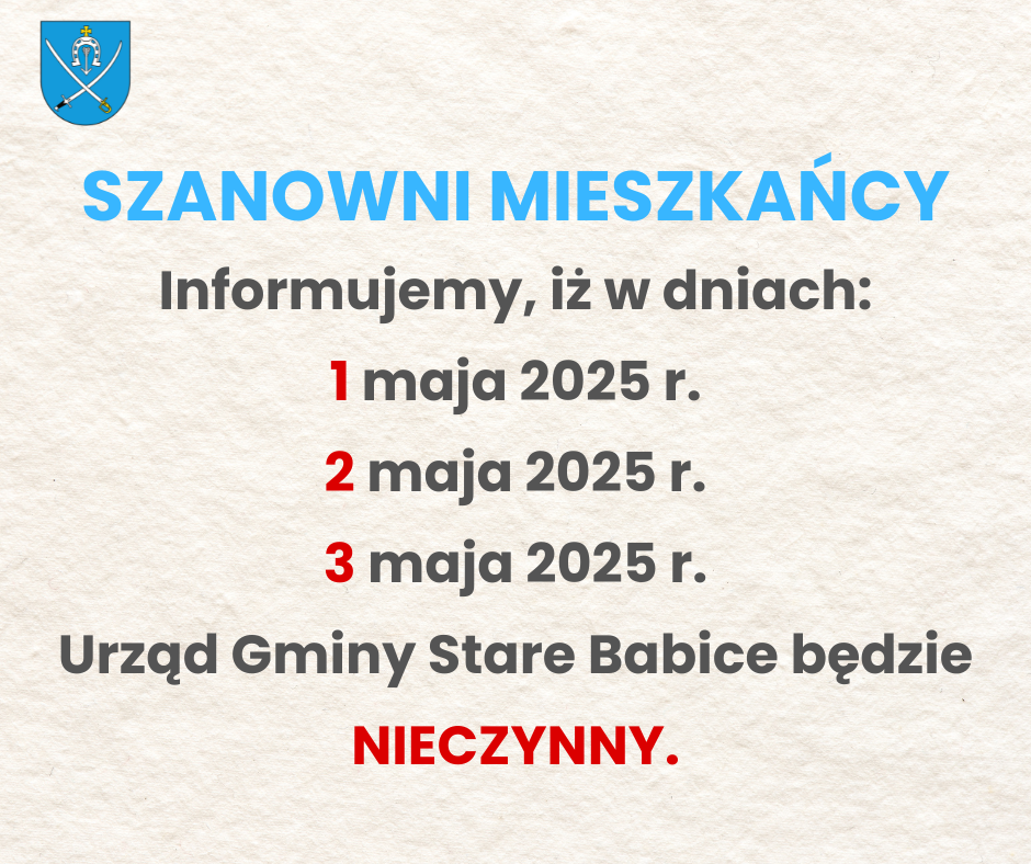Informujemy, iż Urząd Gminy Stare Babice będzie nieczynny w dniach 1-3 maja 2025 roku.