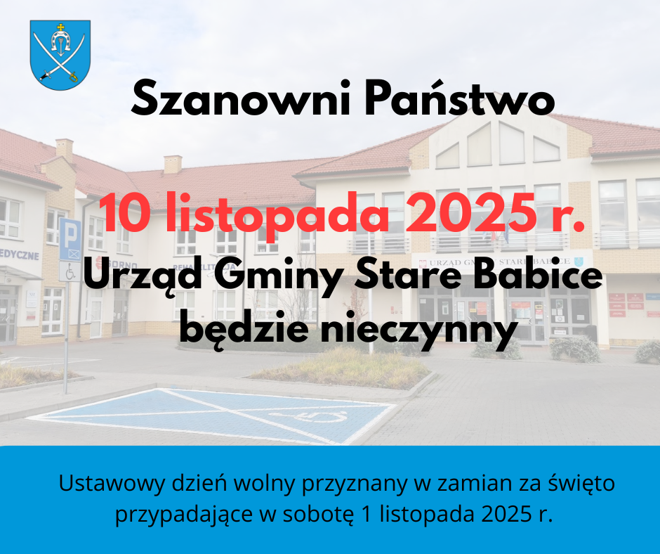 Informujemy, iż w dniu 10 listopada 2025 r. (poniedziałek) Urząd Gminy Stare Babice będzie nieczynny.