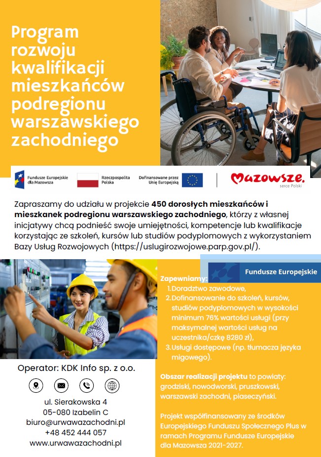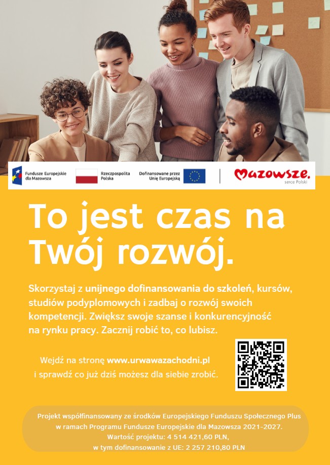 Projekt „Program rozwoju kwalifikacji mieszkańców podregionu warszawskiego zachodniego” nr FEMA.07.04-IP.02-02WX/24 jest współfinansowany ze środków Europejskiego Funduszu Społecznego Plus w ramach programu