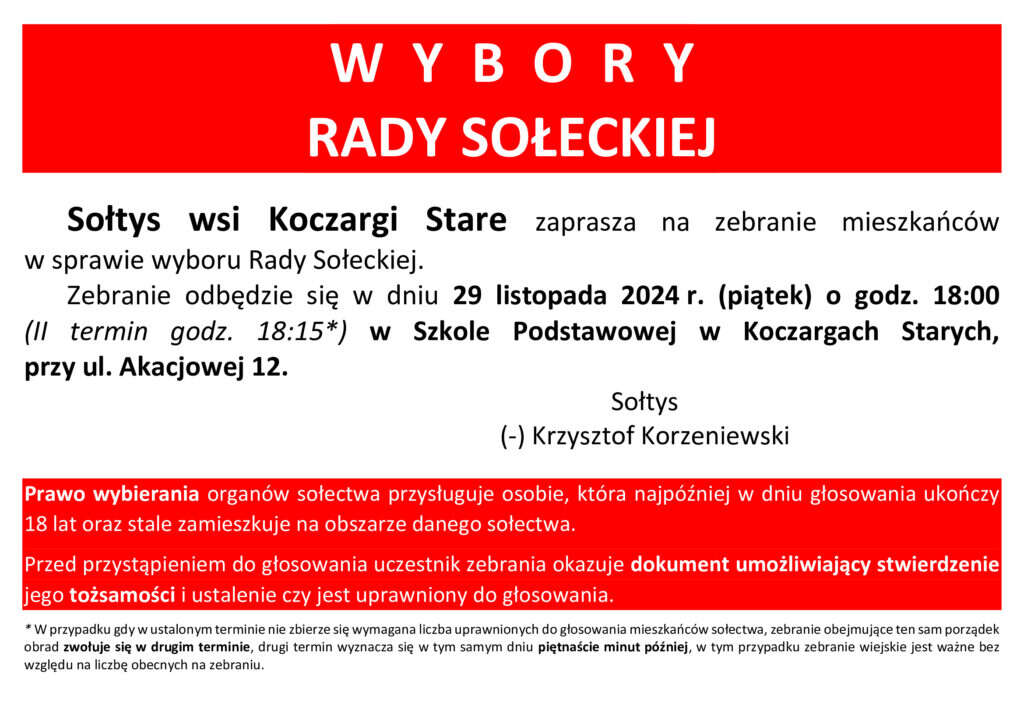 Sołtys wsi Koczargi Stare zaprasza na zebranie mieszkańców w sprawie wyboru Rady Sołeckiej sołectwa Koczargi Stare.