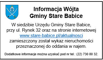 Wójt Gminy Stare Babice podaje do publicznej wiadomości wykaz nieruchomości przeznaczonej do najmu w drodze bezprzetargowej, zgodnie z art. 35 ust 1 i 2 ustawy z dnia 21 sierpnia 1997 r. o gospodarce nieruchomościami (Dz. U. z 2024 r. poz. 1145 ze zm.)