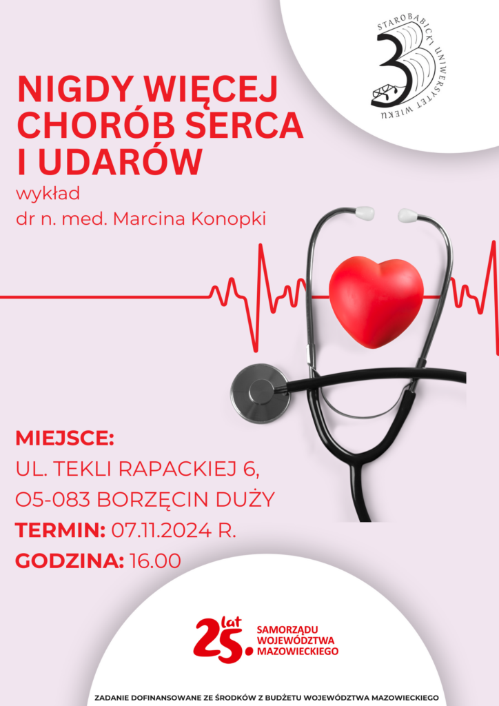 W ramach zadania z zakresu zdrowia publicznego dotyczącego edukacji zdrowotnej dotyczącej profilaktyki chorób układu krążenia, w tym zawałów serca, udarów mózgu zapraszamy na wykład, który poprowadzi dla Państwa dr n. med. Marcin Konopka pod tytułem „Nigdy więcej chorób serca i udarów”.