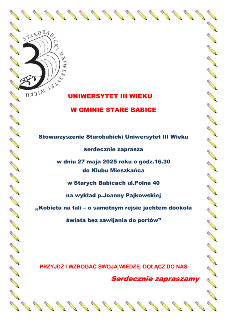 Stowarzyszenie Starobabicki Uniwersytet Trzeciego Wieku zaprasza we wtorek 27 maja 2025 r. o godz.16.30 do Klubu Mieszkańca na wykład Pani Joanny Pajkowskiej „KOBIETA NA FALI O SAMOTNYM REJSIE JACHTEM DOOKOŁA ŚWIATA BEZ ZAWIJANIA DO PORTÓW”