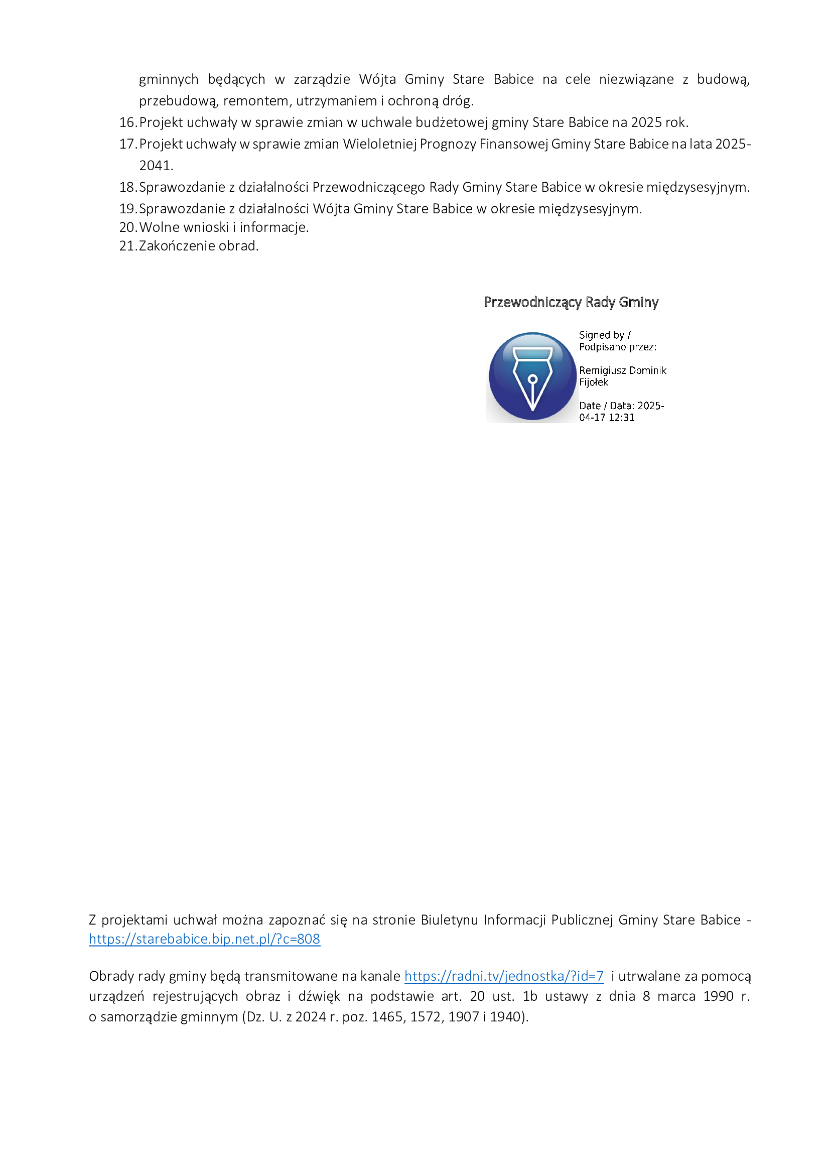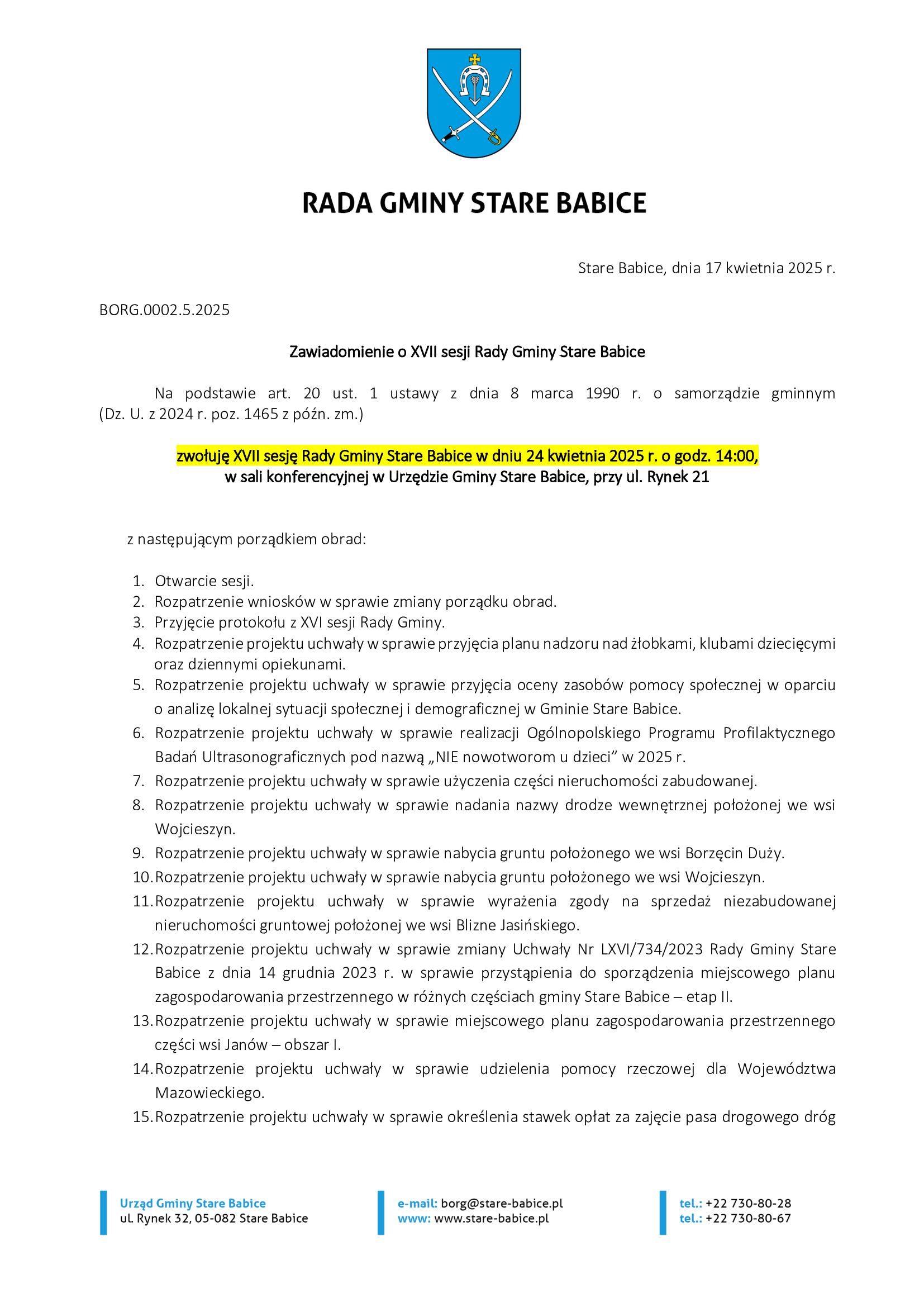 w imieniu Przewodniczącego Rady Gminy Pana Remigiusza Fijołka informuję, że XVII sesja Rady Gminy odbędzie się w czwartek 24 kwietnia 2025 r. o godz. 14:00 w sali konferencyjnej Urzędu Gminy Stare Babice przy ul. Rynek 21 z następującym porządkiem obrad.