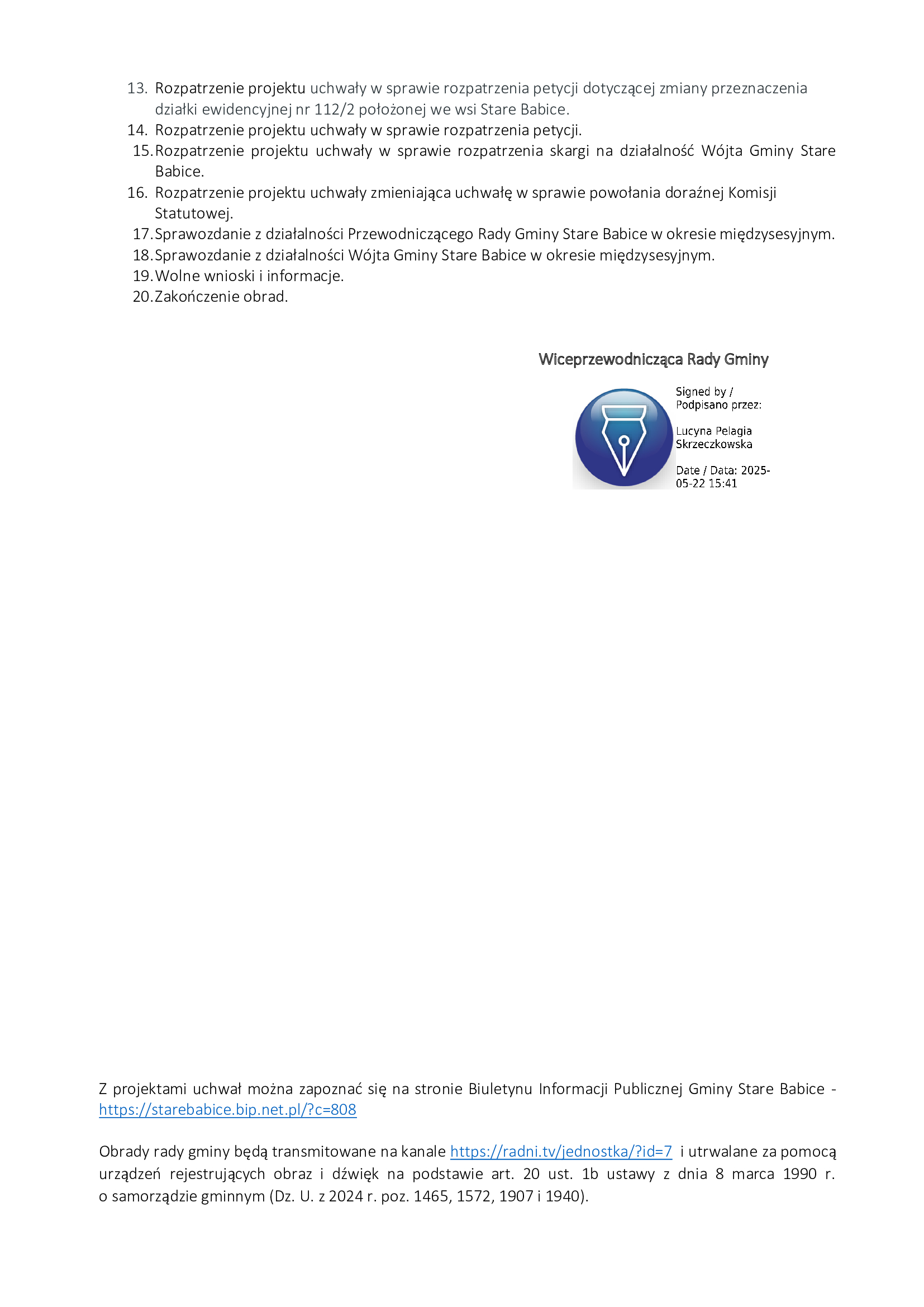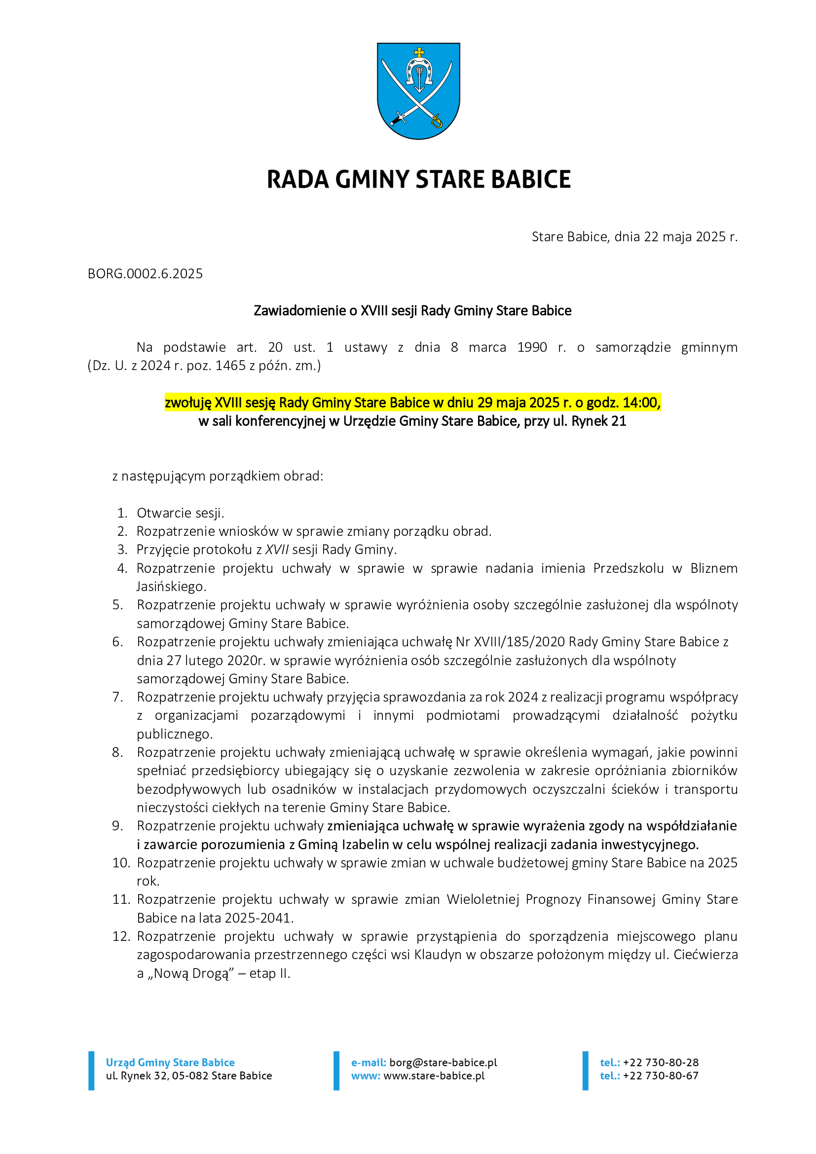 w imieniu Wiceprzewodniczącej Rady Gminy Pani Lucyny Skrzeczkowskiej informuję, że XVIII sesja Rady Gminy odbędzie się w czwartek 29 maja 2025 r. o godz. 14:00 w sali konferencyjnej Urzędu Gminy Stare Babice przy ul. Rynek 21 z następującym porządkiem obrad.