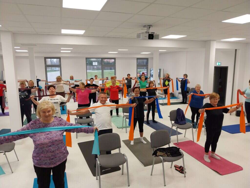 Spotykamy się na bezpłatnej gimnastyce w ramach projektu pt. „Ruch rozwijający seniora” dofinansowanego przez Gminę Stare Babice. Zajęcia są przystosowane do potrzeb grupy a przestronna i widna sala przyciąga coraz więcej zainteresowanych „dojrzałych dorosłych”.