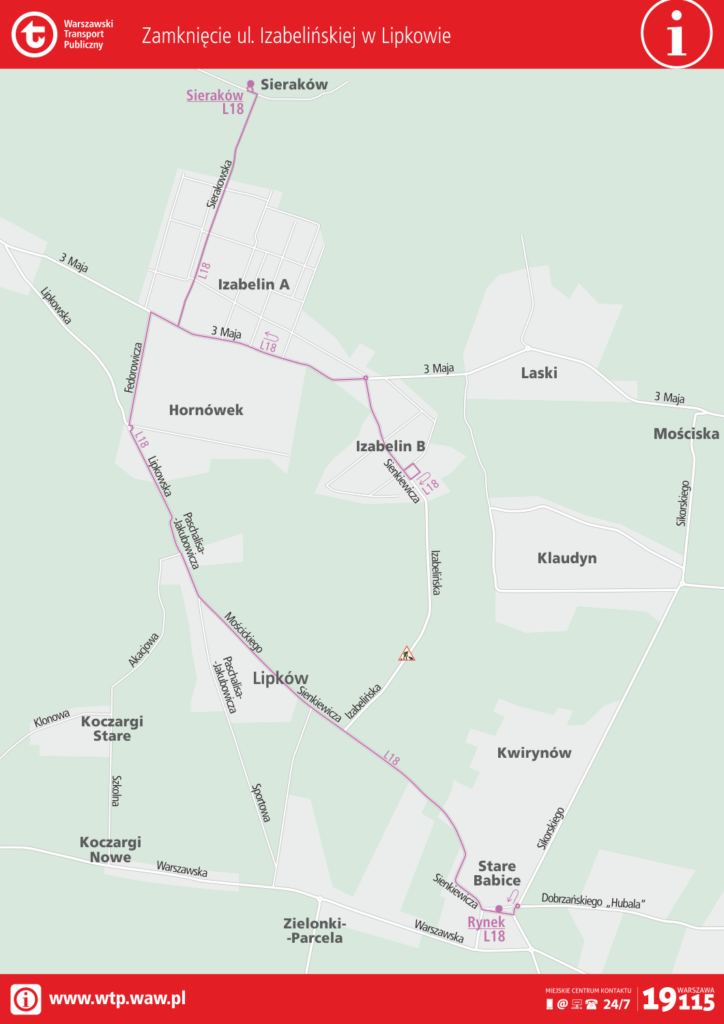 W związku z pracami drogowymi na ul. Izabelińskiej w Lipkowie (gm. Stare Babice) od środy 25.09.2024 r. do odwołania zmieniona zostaje trasa linii L18: