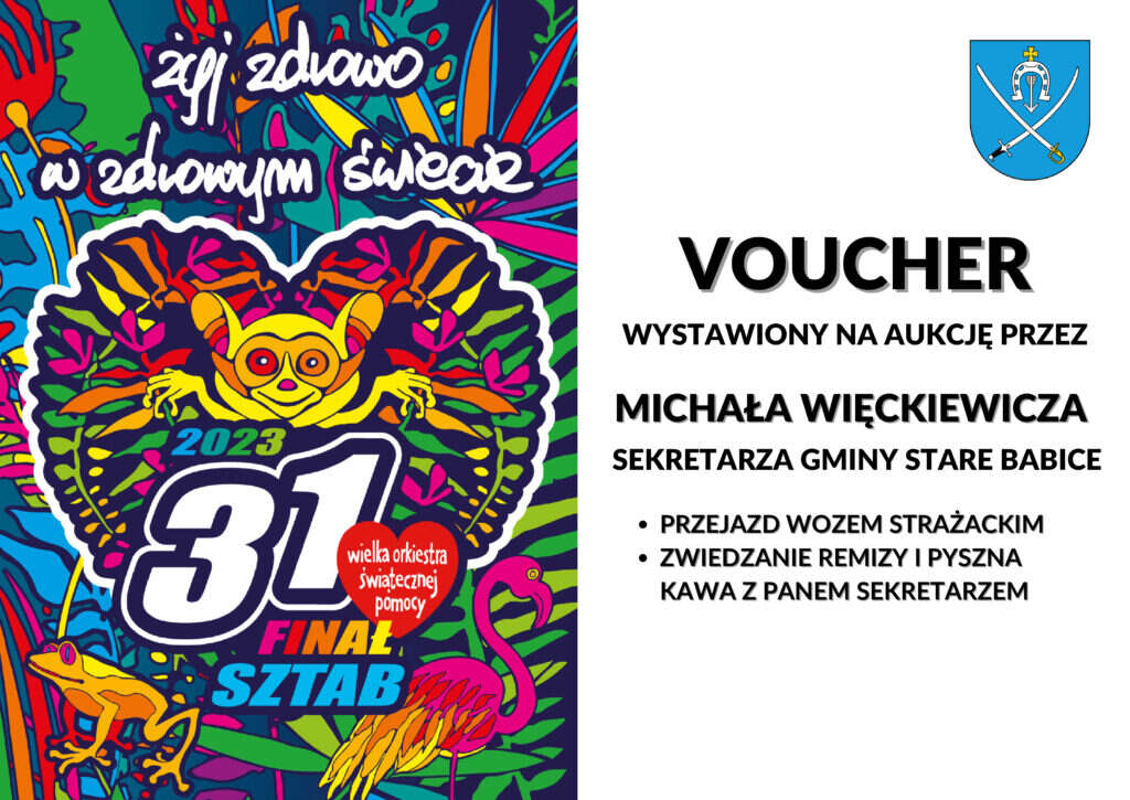 Uprzejmie informujemy, że do 12 lutego 2023 roku można licytować voucher Sekretarza Gminy Stare Babice Michała Więckiewicza w ramach 31. Finału Wielkiej Orkiestry Świątecznej Pomocy.