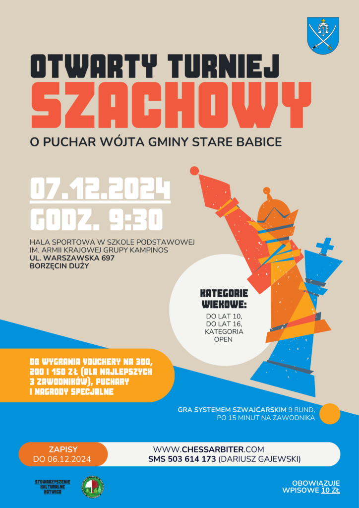Zapraszamy na Otwarty Turniej Szachowy o Puchar Wójta Gminy Stare Babice!