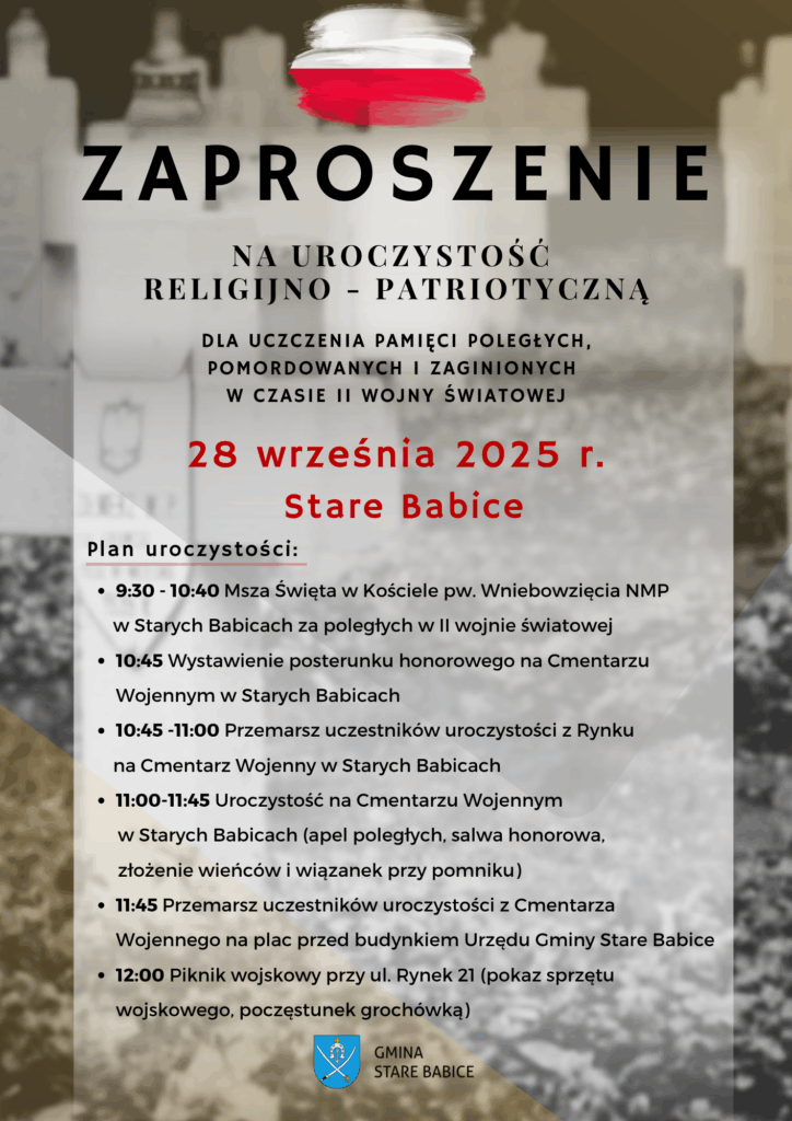 🇵🇱 Wójt Gminy Stare Babice oraz Przewodniczący Rady Gminy Stare Babice mają zaszczyt zaprosić Mieszkańców oraz Gości na uroczystość, religijno-patriotyczną dla uczczenia pamięci poległych, pomordowanych i zaginionych w czasie II wojny światowej, która odbędzie się 28 września 2025 r. (niedziela) w Starych Babicach.