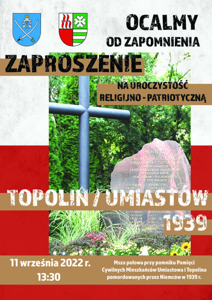 Zapraszamy na uroczystość religijno – patriotyczną związaną z upamiętnieniem mieszkańców Topolina i Umiastowa, pomordowanych 13 września 1939 roku.