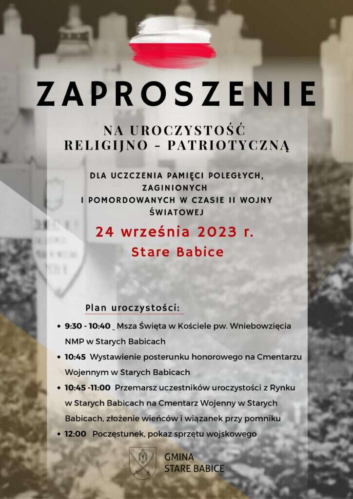 Wójt Gminy Stare Babice serdecznie zaprasza na uroczystość religijno-patriotyczną dla uczczenia pamięci poległych, zaginionych i pomordowanych w czasie II wojny światowej, która odbędzie się 24 września 2023 roku w Starych Babicach.