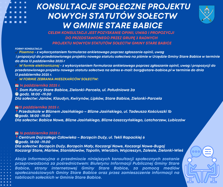 Postanawiam zainicjować i przeprowadzić konsultacje społeczne z Mieszkańcami Gminy Stare Babice, w tym Mieszkańcami wszystkich Sołectw tej Gminy, nad projektami nowych Statutów dla każdego Sołectwa w Gminie Stare Babice, tj.: