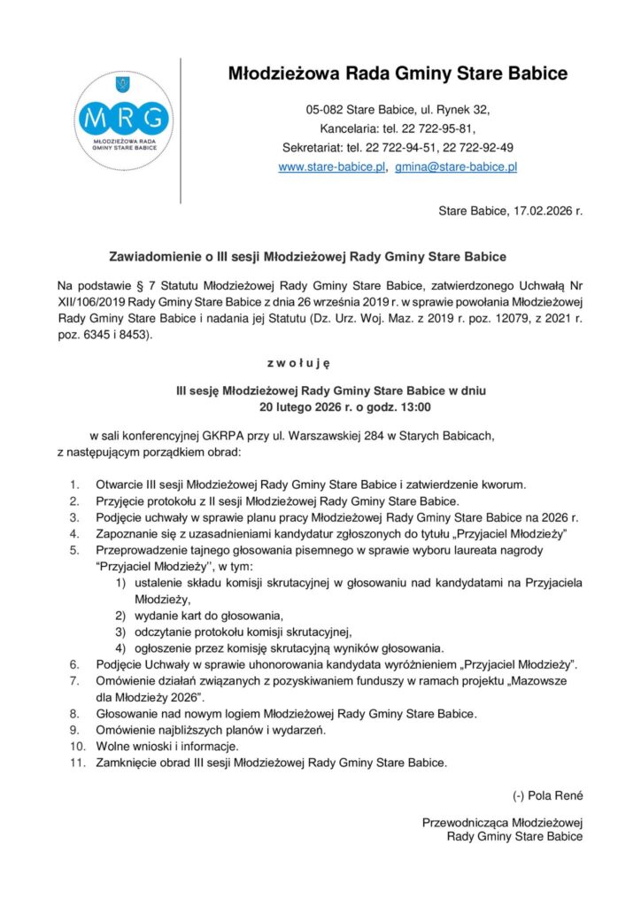 zwołuję III sesję Młodzieżowej Rady Gminy Stare Babice.