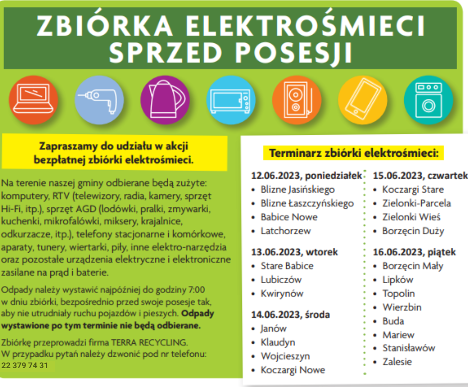 Zbiórkę przeprowadzi firma TERRA RECYCLING, która specjalizuje się w recyklingu odpadów elektronicznych i elektro-urządzeń. W razie pytań lub wątpliwości prosimy dzwonić pod numer telefonu: 22 379 74 31.