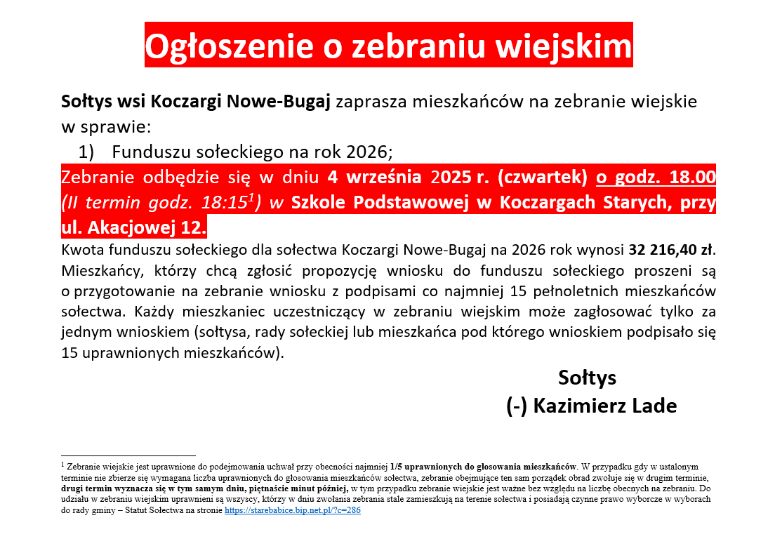 Sołtys wsi Koczargi Nowe-Bugaj zaprasza mieszkańców na zebranie wiejskie
