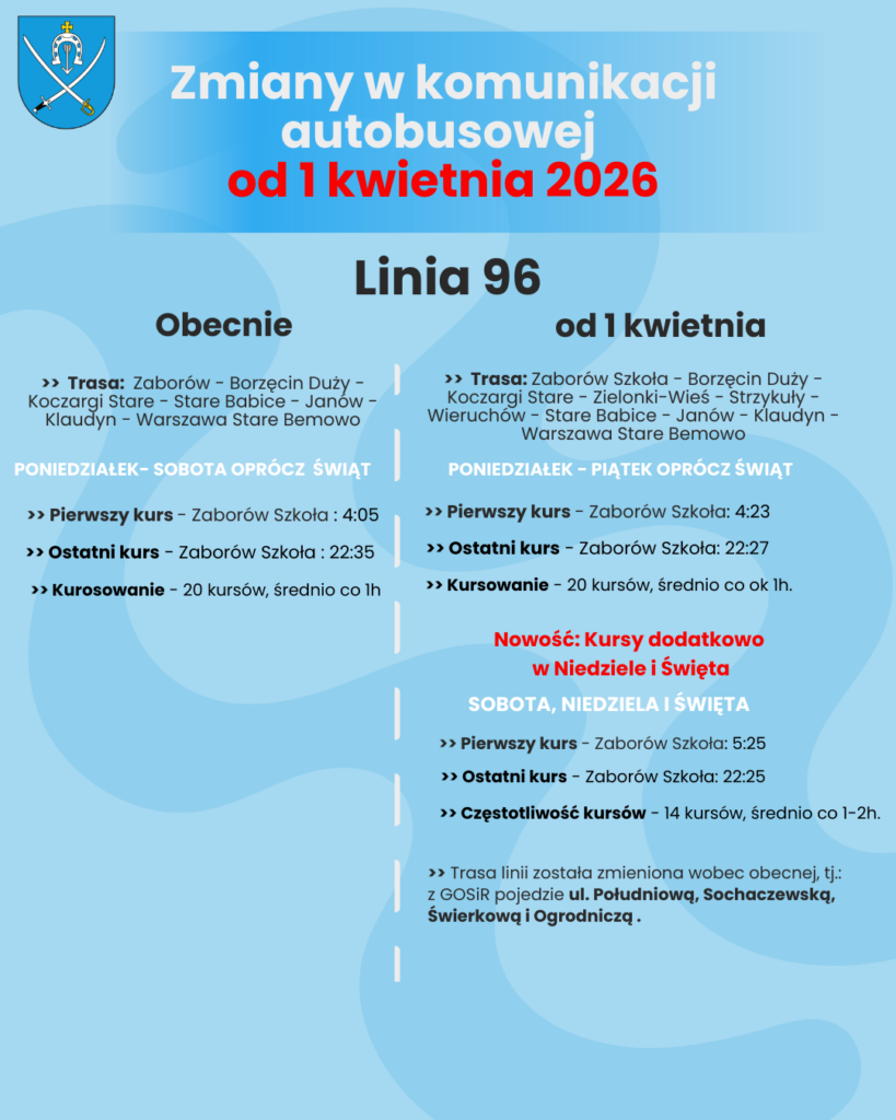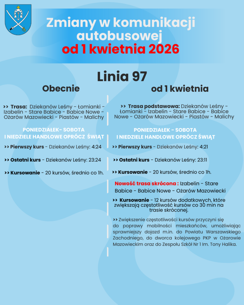 Od 01.04.2026 nastąpią zmiany w komunikacji publicznej organizowanej przez Grodziskie Przewozy Autobusowe na liniach 96, 97.