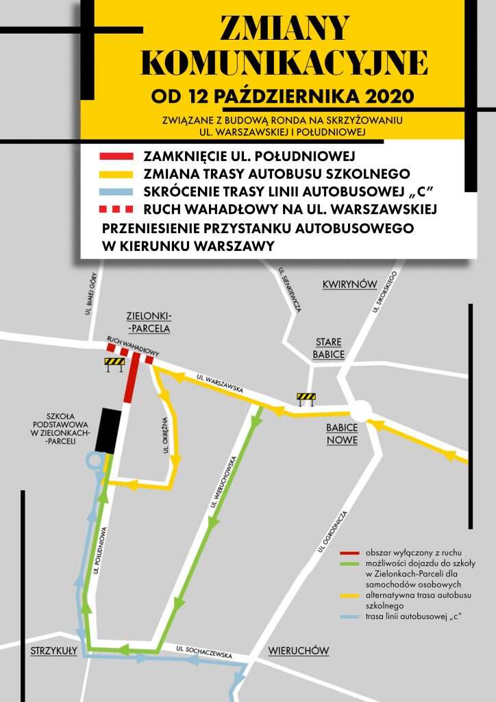 Od 12 października 2020 r. zostaną wprowadzone zmiany komunikacyjne związane z budową ronda na skrzyżowaniu ul. Warszawskiej i ul. Południowej.