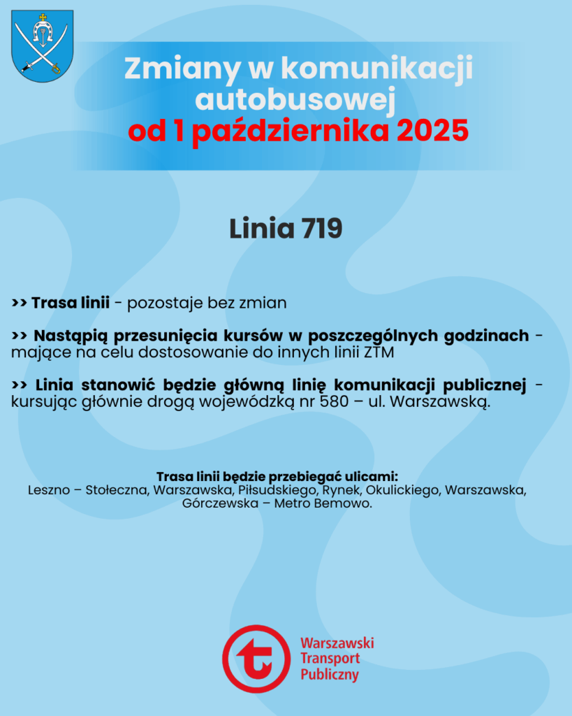 🚌 Linia 719 – trasa linii pozostaje bez zmian, natomiast nastąpią przesunięcia kursów w poszczególnych godzinach mające na celu dostosowanie do innych linii ZTM. Linia stanowić będzie główną linię komunikacji publicznej dla mieszkańców gminy kursując głównie drogą wojewódzką nr 580 – ul. Warszawską. W dni powszednie dostępne będzie 56 kursów na trasie Leszno – Metro Bemowo.