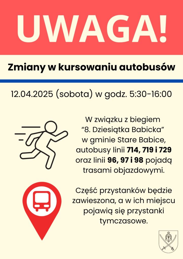 W związku z imprezą biegową 8. Skynet Dziesiątka Babicka w gminie Stare Babice, linie autobusowe 714, 719 i 729 oraz linie 96, 97, 98 zostaną skierowane na trasy objazdowe. Zmienią się również lokalizacje niektórych przystanków – część zostanie zawieszona, a w ich miejsce uruchomione będą przystanki tymczasowe.