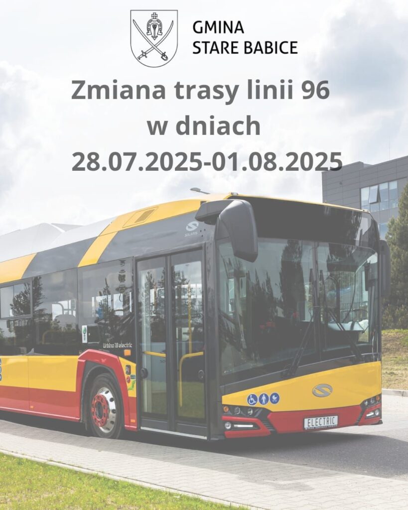 🟡 W związku z robotami drogowymi i zamknięciem ul. Trakt Królewski w miejscowości Wierzbin (Gmina Stare Babice) między ulicami Królewicza Jakuba a Spacerową w dniach 28.07.2025 – 01.08.2025 (włącznie) autobusy linii 96 będą kursowały trasą objazdową przebiegającą ulicami Królewicza Jakuba i Warszawską.