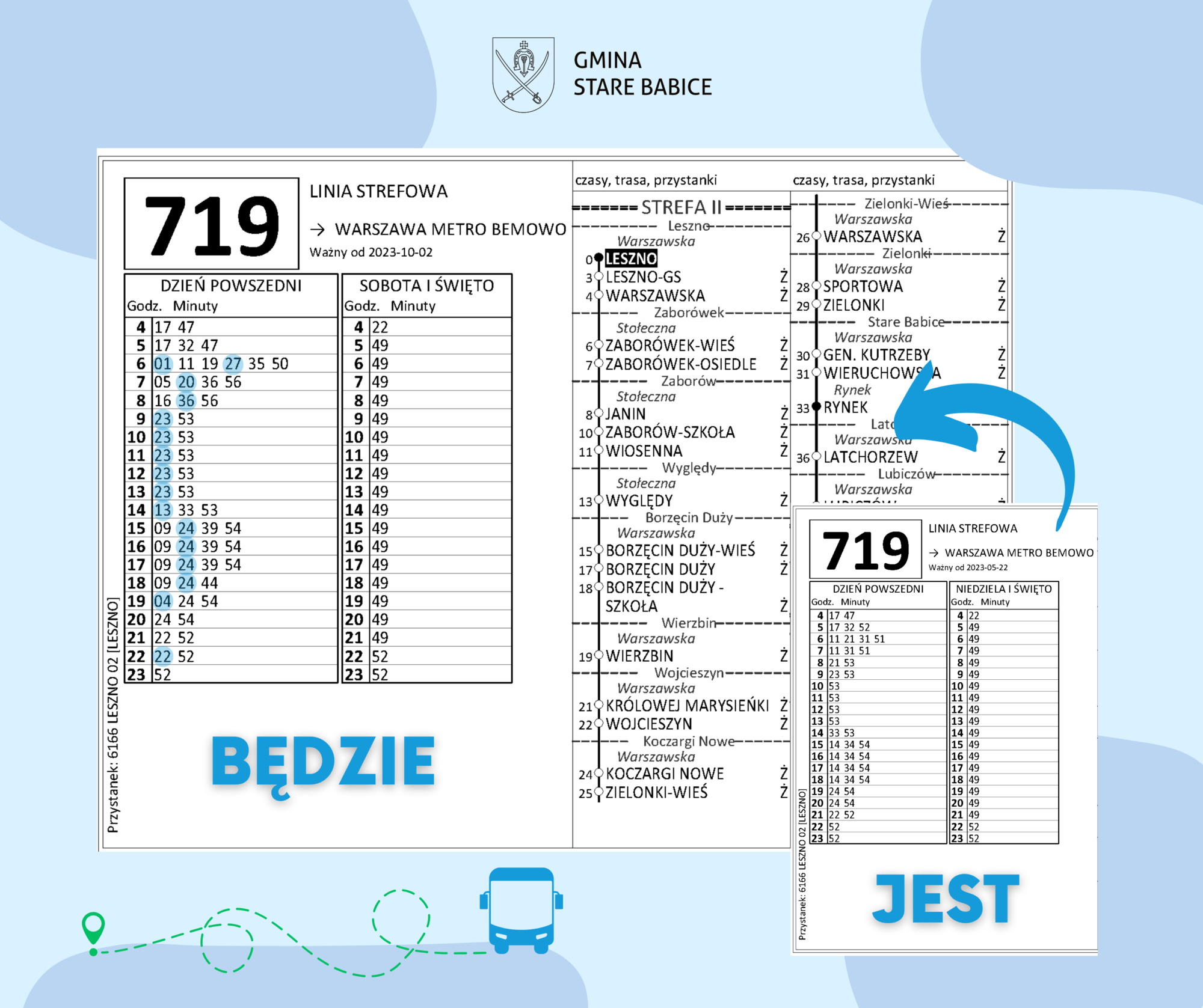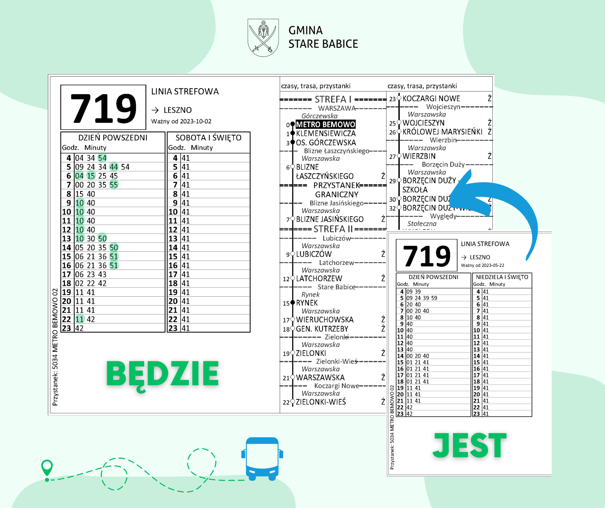 W wyniku prowadzonych rozmów Wójta Gminy Stare Babice Sławomira Sumki z Zarządem Transportu Miejskiego, autobusy linii 719 będą kursować ze zwiększoną częstotliwością.